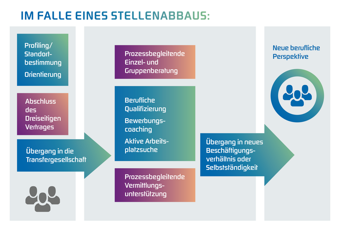 Im Falle eines notwendigen Personalabbaus unterstützen wir Sie mit der Durchführung einer Transfergesellschaft. Dazu schließen Arbeitgeber- und Arbeitnehmervertreter zunächst einen Transfersozialplan, der den betroffenen Mitarbeiterinnen und Mitarbeitern den Übergang in die Transfergesellschaft ermöglicht. Das heißt, sie schließen einen Aufhebungsvertrag mit dem Arbeitgeber und gleichzeitig einen auf maximal zwölf Monate befristeten Beschäftigungsvertrag mit uns – einen Dreiseitigen Vertrag, der zwischen drei Vertragsparteien geschlossen wird. Der Vorteil: Dadurch werden die Mitarbeiterinnen und Mitarbeiter nicht arbeitslos, sondern werden bei der Agentur für Arbeit lediglich als arbeitsuchend geführt.